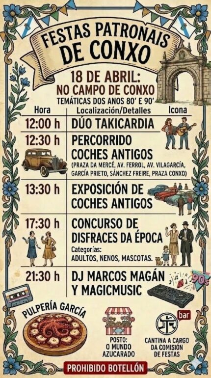 O programa das festas, a celebrase o 18 de abril, inclúe actuacións musicais, un percorrido de vehículos, unha exposición de coches clásicos, un concurso de disfraces e varios postos de hostalería xestionados pola propia Comisión. A falta de subministración eléctrica obrigaría á organización a asumir custos adicionais para poder garantir a celebración.