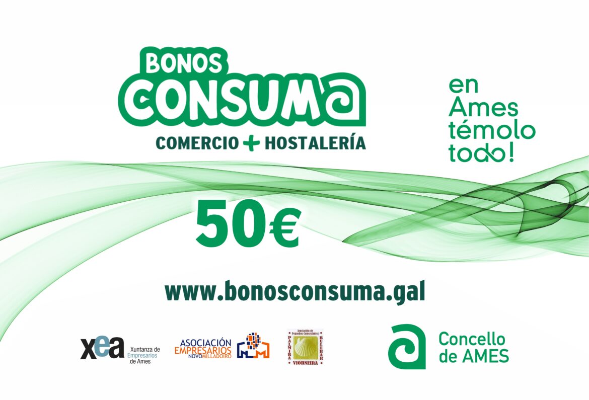 Ames, 18 de decembro de 2025.- O Concello de Ames, a través da Concellaría de Promoción Económica, desenvolve un ano máis a campaña dos Bonos Consuma, unha iniciativa para fomentar o consumo no comercio local. O prazo para descargar os bonos estará aberto desde mañá, venres 19 de decembro. Cada persoa maior de 18 anos poderá descargar un único bono con importe de 50 euros que poderá usar nos 109 establecementos adheridos á campaña deste ano. Para descargar os bonos hai que entrar no apartado de clientes da páxina web dos bonos consuma e introducir os datos persoais do beneficiario. Os bonos poderán gastarse do 19 de decembro ao 19 de febreiro de 2026, ou ata que se esgote o orzamento do programa. Este ano o orzamento da campaña é de 60.000 euros. No caso de que se esgote o orzamento do programa, os vales descargados deixarán de ter saldo, polo que non se poderán empregar. Pódese consultar as empresas adheridas á campaña na seguinte ligazón.