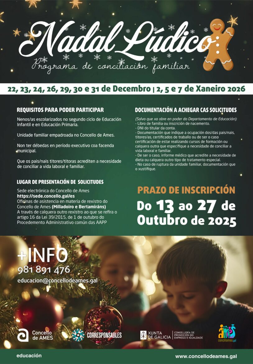 Ames, 13 de outubro de 2025.- Dende hoxe, luns día 13, e ata o vindeiro luns 27 de outubro de 2025, está aberto o prazo para inscribirse no servizo de conciliación “Nadal Lúdico”, que se desenvolverá os días 22, 23, 24, 26, 29, 30 e 31 de decembro, e os días 2, 5 e 7 de xaneiro de 2026. Poderán participar aquelas familias empadroadas no concello de Ames, con nenos e nenas escolarizados no segundo ciclo de educación infantil ou en primaria, e que teñan a necesidade de conciliar. O programa ten un horario de 7:30 a 16:00 horas, e inclúe os servizos de comedor e Bos Días. As persoas interesadas deben entregar a documentación necesaria na Sede electrónica do Concello de Ames, ou ben nas oficinas de asistencia en materia de rexistro do Concello de Ames (O Milladoiro e Bertamiráns)
