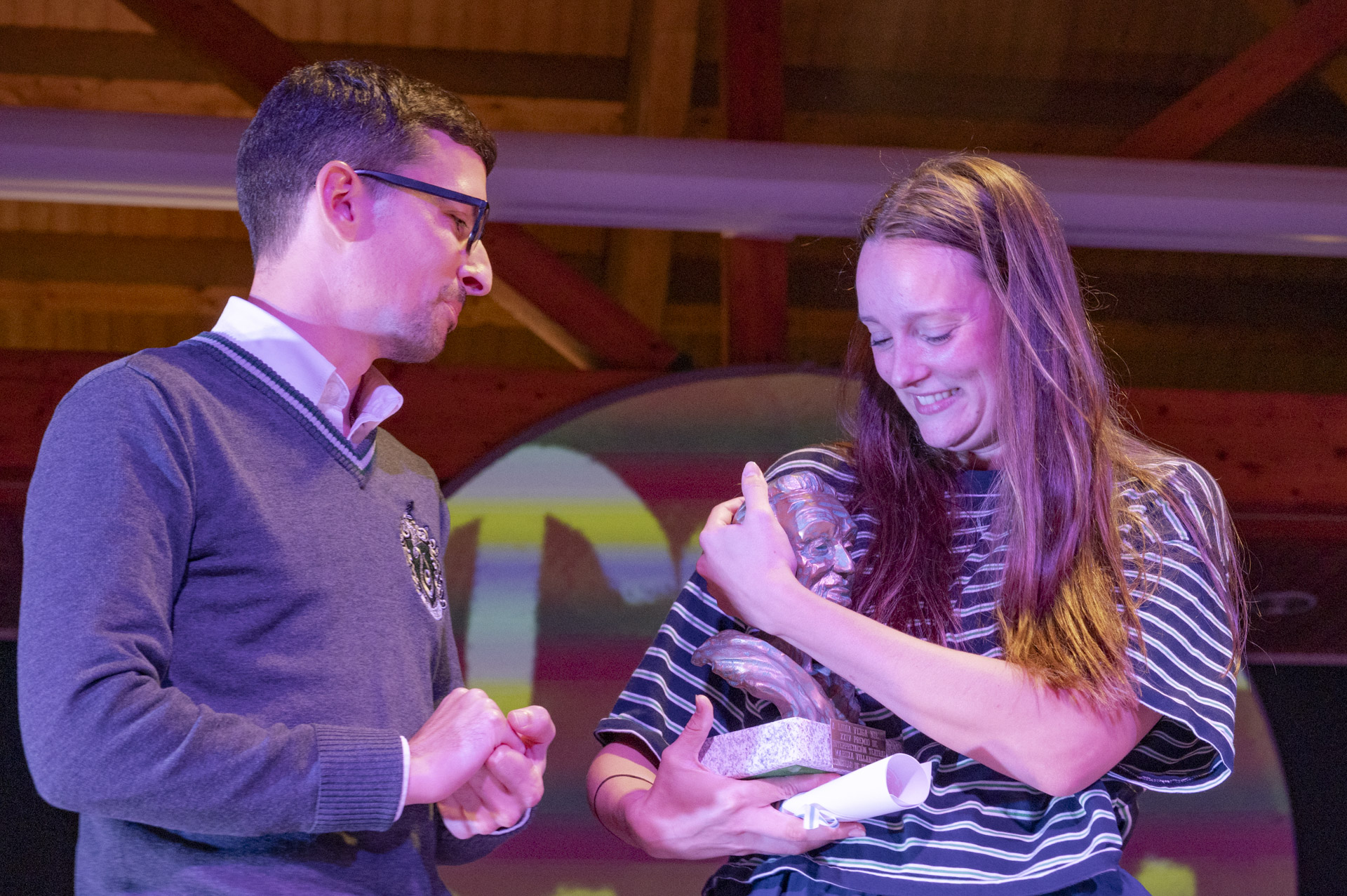 O premio está dotado con 1.200 euros, un diploma acreditativo e unha figura coa imaxe da actriz padronesa que dá nome ao galardón. “Encántame esta escultura”, asegurou Lidia Veiga cando Anxo Arca lle entregou o busto de Maruxa Villanueva.