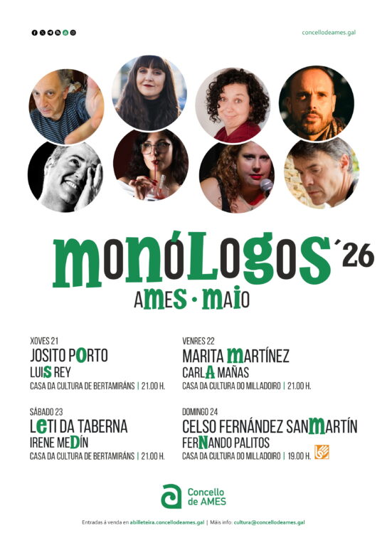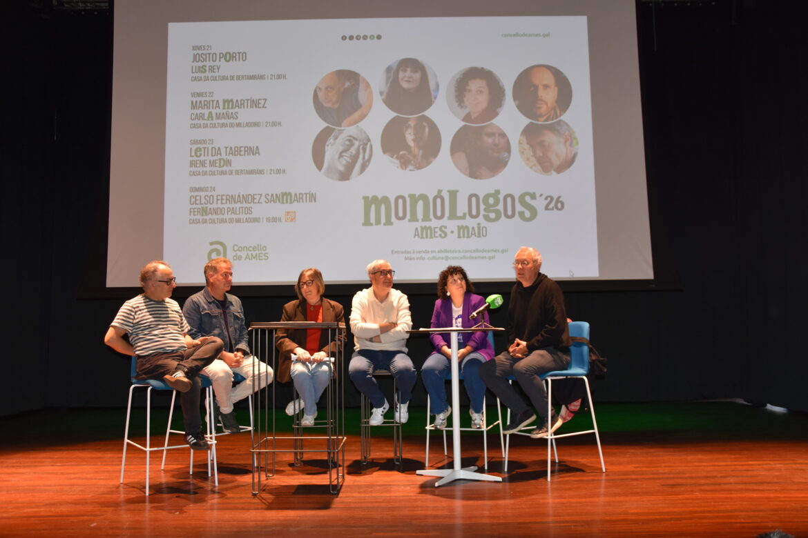 Ames, 28 de abril de 2026 – O Concello de Ames, a través do departamento de Cultura, presentou esta mañá a terceira edición do ciclo de monólogos, que se celebrarán entre o 21 e o 24 de maio nas Casas da Cultura de Bertamiráns e O Milladoiro. Monologuistas como Leti da Taberna, Josito Porto ou Celso Fernández Sanmartín participarán nunhas xornadas nas que haberá interpretación en lingua de signos. As entradas xa están dispoñibles na Billeteira electrónica do Concello de Ames.