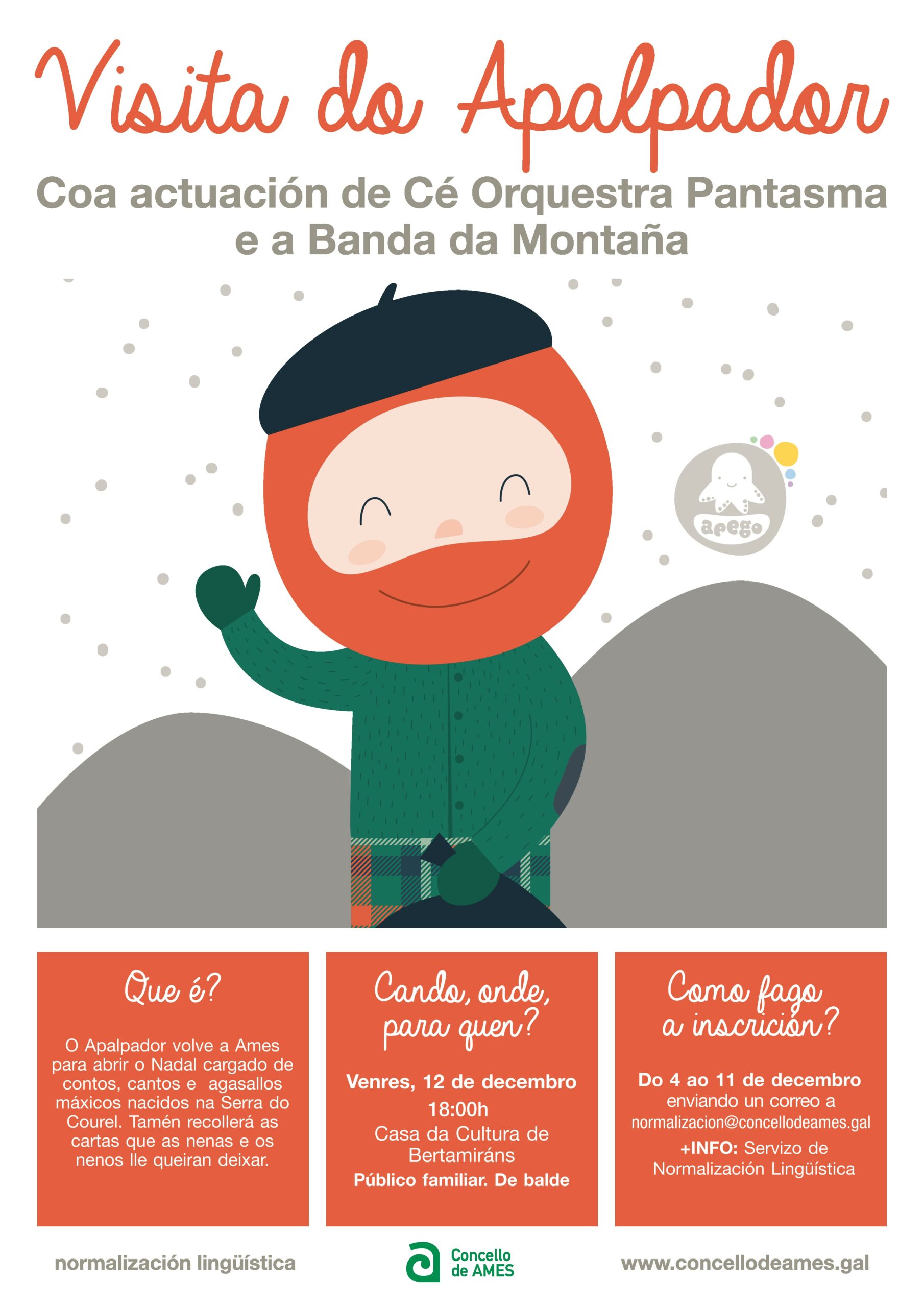 Ames, 4 de decembro de 2025.- O Apalpador visitará Ames o vindeiro venres 12 de decembro, ás 18.00 horas na Casa da Cultura de Bertamiráns. A visita, enmarcada dentro do programa Apego, contará tamén coas actuacións musicais da Banda da Montaña e de Cé Orquestra Pantasma. Para asistir, é preciso facer unha inscrición previa enviando un correo ao enderezo normalizacion@concellodeames.gal, indicando nome e apelidos dos asistentes, idade dos cativos e un teléfono de contacto. O prazo de inscrición está aberto do 5 ao 12 de decembro.