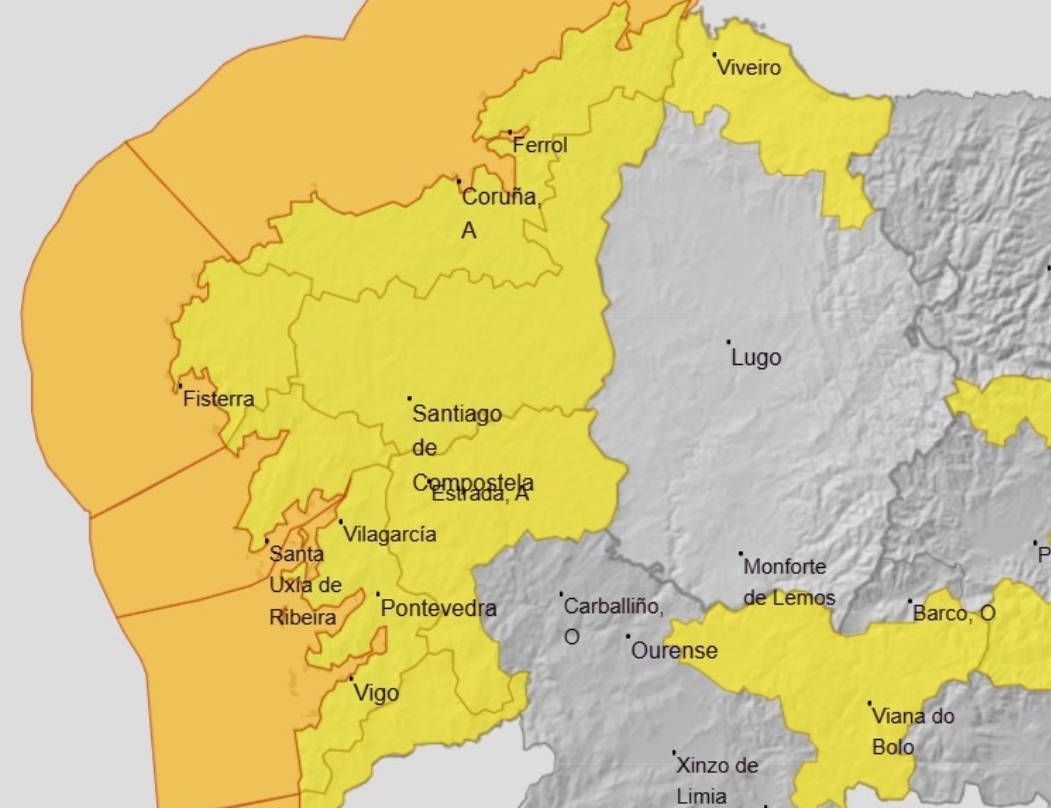 También estarán en aviso amarillo las provincias de A Coruña y Pontevedra, el extremo norte de Lugo y la montaña de Ourense, por vientos del sur con rachas que podrían alcanzar los 70-80 km/h.