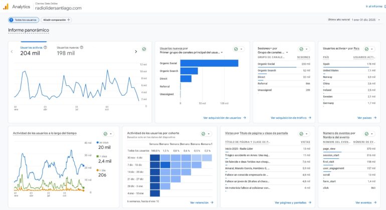 La web de Radio Líder Santiago cerró 2025 con un balance de audiencia que confirma su consolidación como uno de los soportes digitales de mayor capacidad de difusión en el entorno local y comarcal. Según el informe anual de analítica, el portal registró 204.000 usuarios activos y 316.000 sesiones, con un total de 370.000 páginas vistas a lo largo del año.