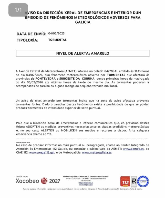 Para información actualizada, se puede consultar la web de AEMET, MeteoGalicia o el Centro Integrado de Atención ás Emerxencias 112 Galicia.