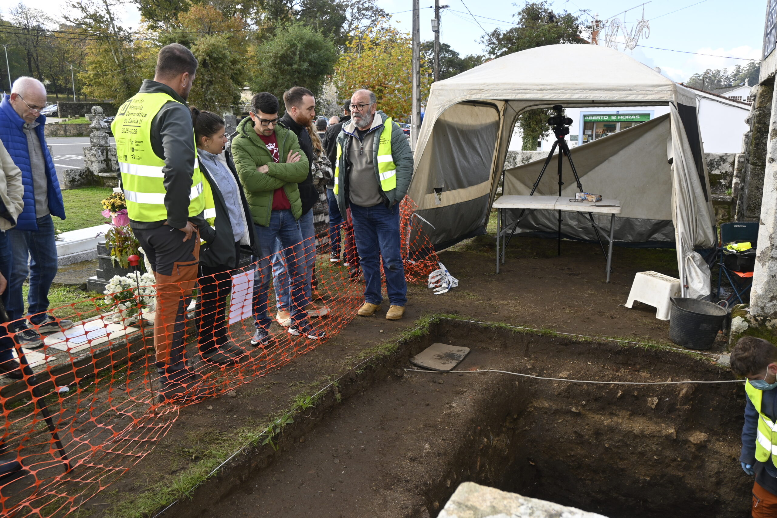 Padrón. 19-11-2025.- O alcalde de Padrón, Anxo Arca, acompañado da concelleira Mariló Saco, desprazouse esta mañá ao cemiterio de Santa María de Luou, en Teo, para coñecer os traballos de estudo e exhumación que o grupo de investigación Histagra (Historia Agraria e Política do Mundo Rural) da Universidade de Santiago de Compostela (USC) está a realizar nunha fosa da resistencia armada antifranquista.