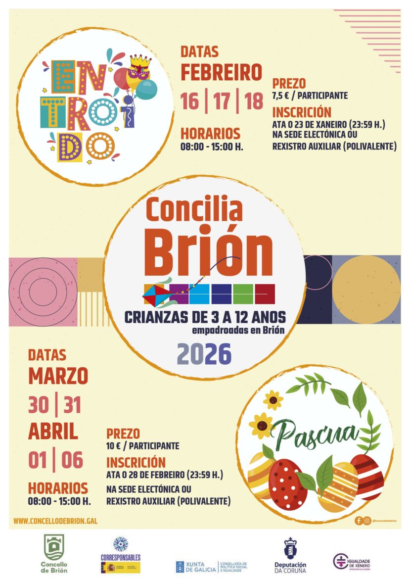 O Concello de Brión vén de abrir inscricións no seu programa “Concilia Brión”, unha actividade de conciliación da vida laboral e familiar que por primeira vez se convoca de forma conxunta para as vacacións escolares de Entroido e Semana Santa. A iniciativa está dirixida a nenos e nenas de 3 a 12 anos de idade e terá lugar no polideportivo municipal, en horario de 8:00 a 15:00 horas. En ambos os dous casos, o Concello de Brión ofrece 30 prazas.