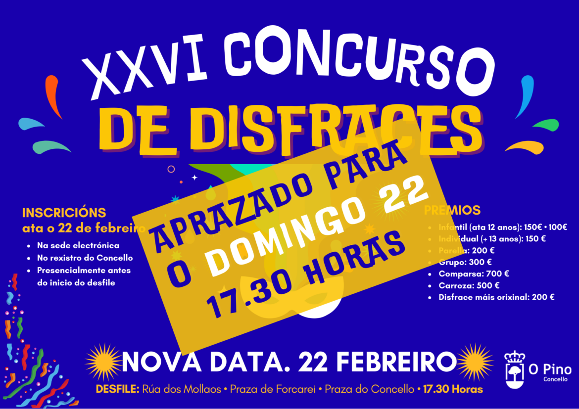 O Pino. 15-2-26.- O Concello do Pino decidiu aprazar para o domingo 22 de febreiro o primeiro desfile de Entroido e o XXVI Concurso de disfraces polas previsión de fortes choivas para a tarde deste 15 de febreiro, data inicialmente prevista para celebrar o destile. O resto do programa mantense como estaba previsto. Tamén se amplía o prazo de inscrición ata o domingo 22. Lémbrase que a inscrición pode facerse en liña (na sede electrónica), no rexistro do concello de luns a venres, ou presencialmente o mesmo día do desfile de 16.00 a 17.00 horas.