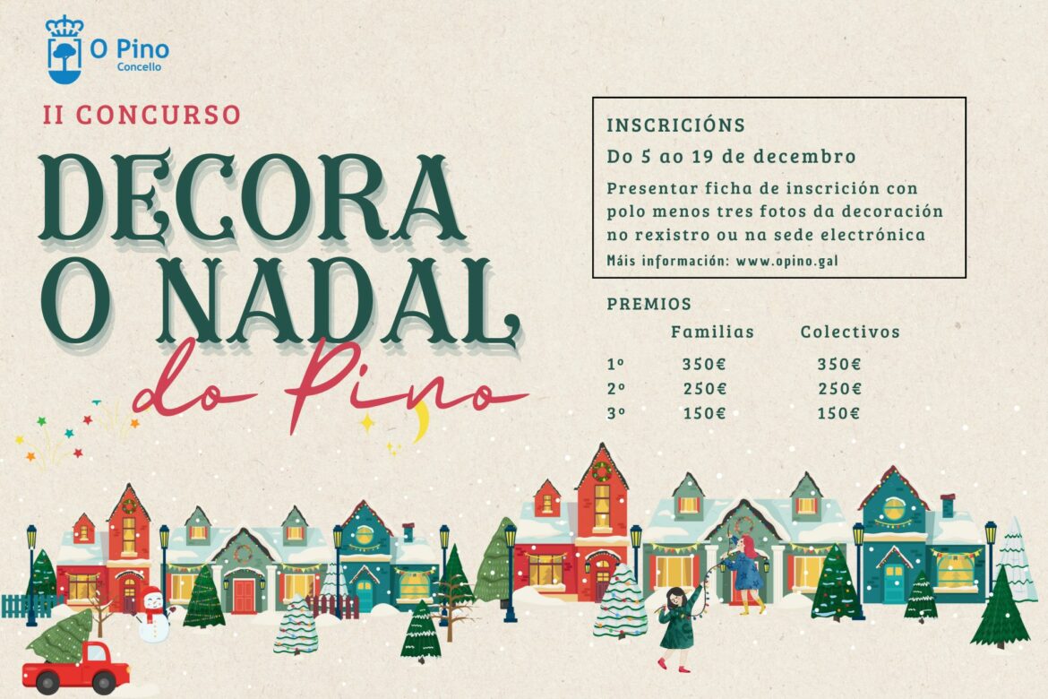 O Pino. 13-11-2025.- O Concello do Pino convoca a segunda edición do Concurso de Decoración de Nadal, unha iniciativa que busca dinamizar a participación cidadá, fomentar a cooperación e o traballo en común, e encher o municipio de espírito festivo e creatividade. A principal novidade desta edición é o incremento da contía dos premios, que pasan dos 300, 200 e 100 euros da anterior convocatoria aos 350, 250 e 150 euros para o primeiro, segundo e terceiro posto en cada categoría.