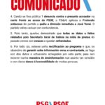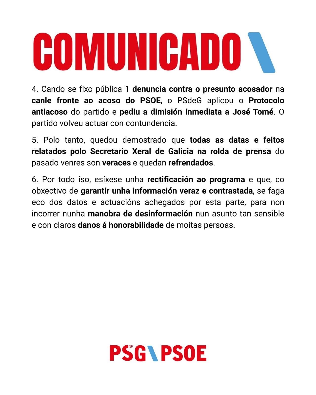O comunicado engade que “cando se fixo pública 1 denuncia contra o presunto acosador na canle fronte ao acoso do PSOE, o PSdeG aplicou o protocolo antiacoso do partido e pediu a dimisión inmediata a José Tomé”, sinalando que “o partido volveu actuar con contundencia”.