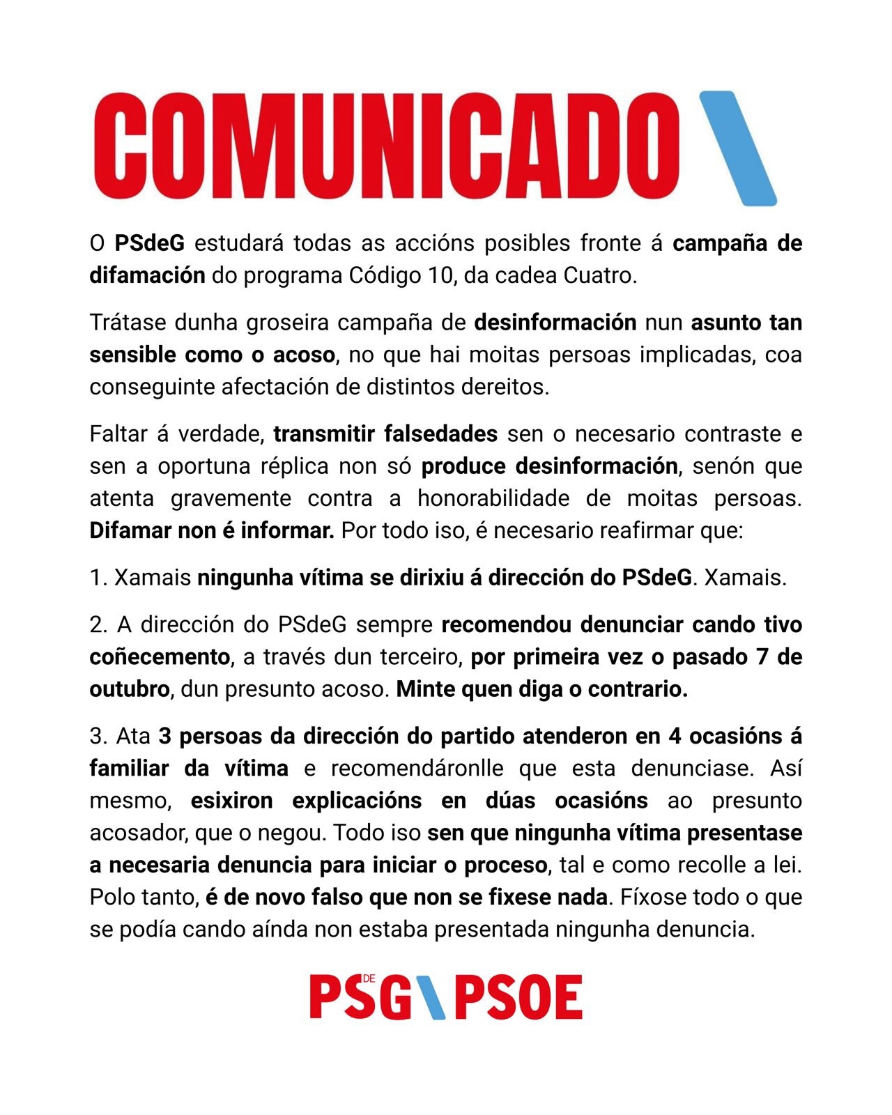 O PSdeG anunciou que estudará “todas as accións posibles” fronte ao que cualifica como unha “campaña de difamación” por parte do programa Código 10, da cadea Cuatro. Nun comunicado feito público, os socialistas galegos aseguran que se trata dunha “groseira campaña de desinformación” arredor “dun asunto tan sensible como o acoso”, no que, segundo subliñan, “hai moitas persoas implicadas, coa conseguinte afectación de distintos dereitos”.