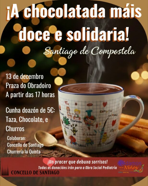 La Obra Social de Pediatría organiza este sábado una chocolatada solidaria en la Praza do Obradoiro, en pleno corazón de Santiago de Compostela. Una iniciativa abierta a toda la ciudadanía con un objetivo claro: recaudar fondos para seguir impulsando proyectos sociales dirigidos a niños, niñas y a sus familias, especialmente en el ámbito hospitalario.