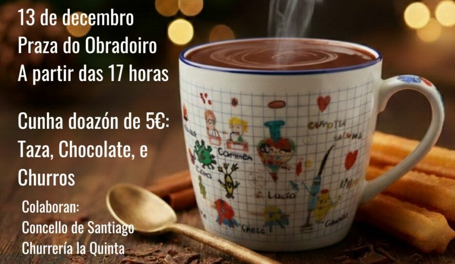 La cita tendrá lugar a partir de las cinco de la tarde y está pensada para disfrutarse en familia. Por un donativo de cinco euros, las personas que se acerquen podrán disfrutar de chocolate caliente con churros, llevarse una taza y participar en la elaboración de una manualidad navideña para los más pequeños. La chocolatada cuenta con la colaboración del Concello de Santiago y de Churrería La Quinta, recientemente reconocida con un Solete Repsol de invierno.