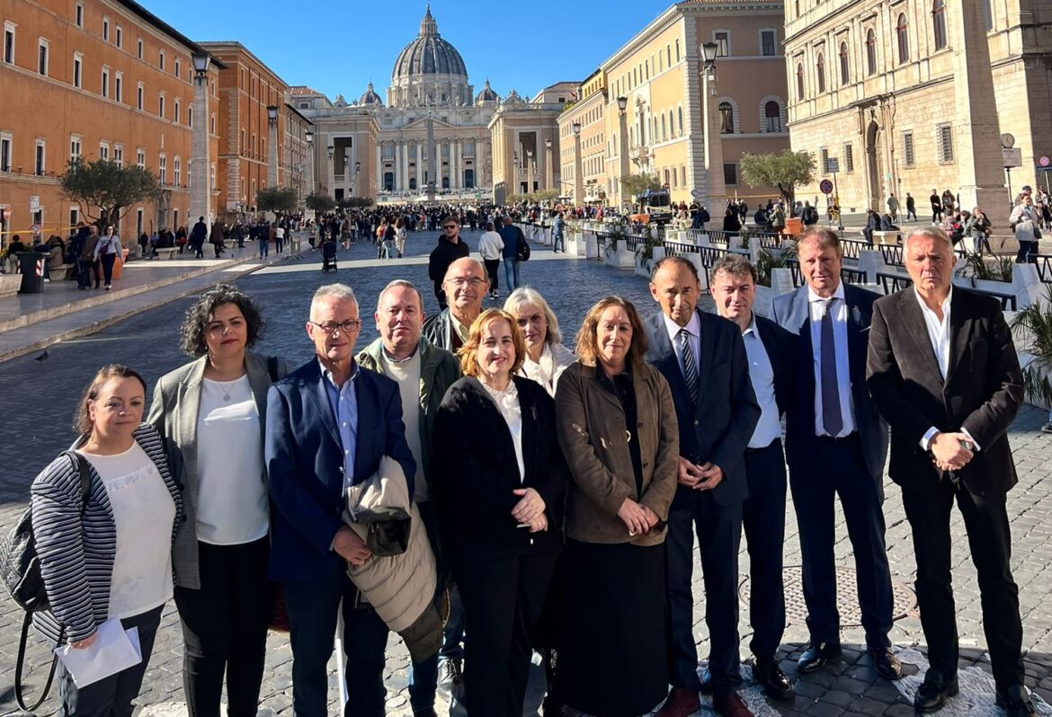 Once rexedores da Mancomunidade de Municipios do Camiño Francés, xunto con membros da Asociación Calle Mayor de Europa, trasladaron este mércores ao papa León XIV unha invitación oficial para realizar unha peregrinación polo Camiño de Santiago con motivo do próximo Ano Santo Compostelán de 2027.