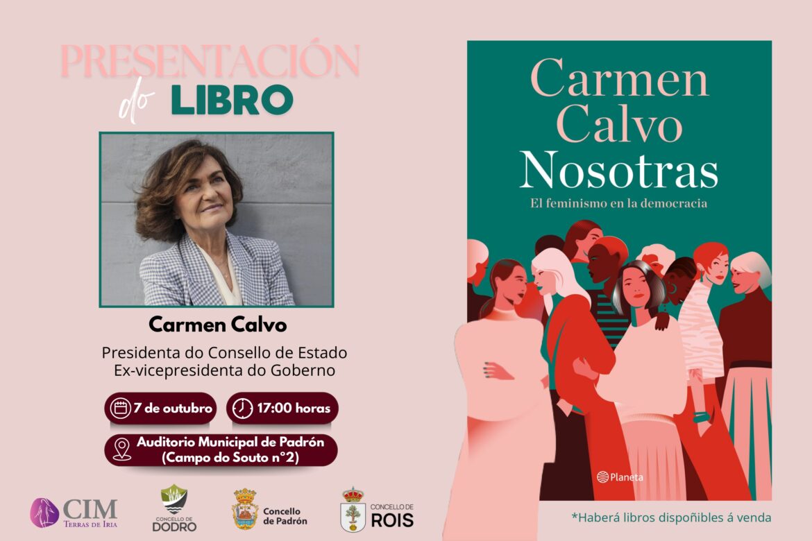 Padrón. 2-10-2025.- O Concello de Padrón, a través do Centro de Información á Muller Terras de Iria, organiza xunto cos concellos de Rois e Dodro a presentación do libro Nosotras: el feminismo en la democracia, da presidenta do Consello de Estado e exvicepresidenta do Goberno, Carmen Calvo. O acto celebrarase o martes 7 de outubro ás 17.00 horas no Auditorio Municipal con entrada libre ata completar aforo. Ademais, as persoas asistentes poderán adquirir exemplares do libro no propio auditorio.