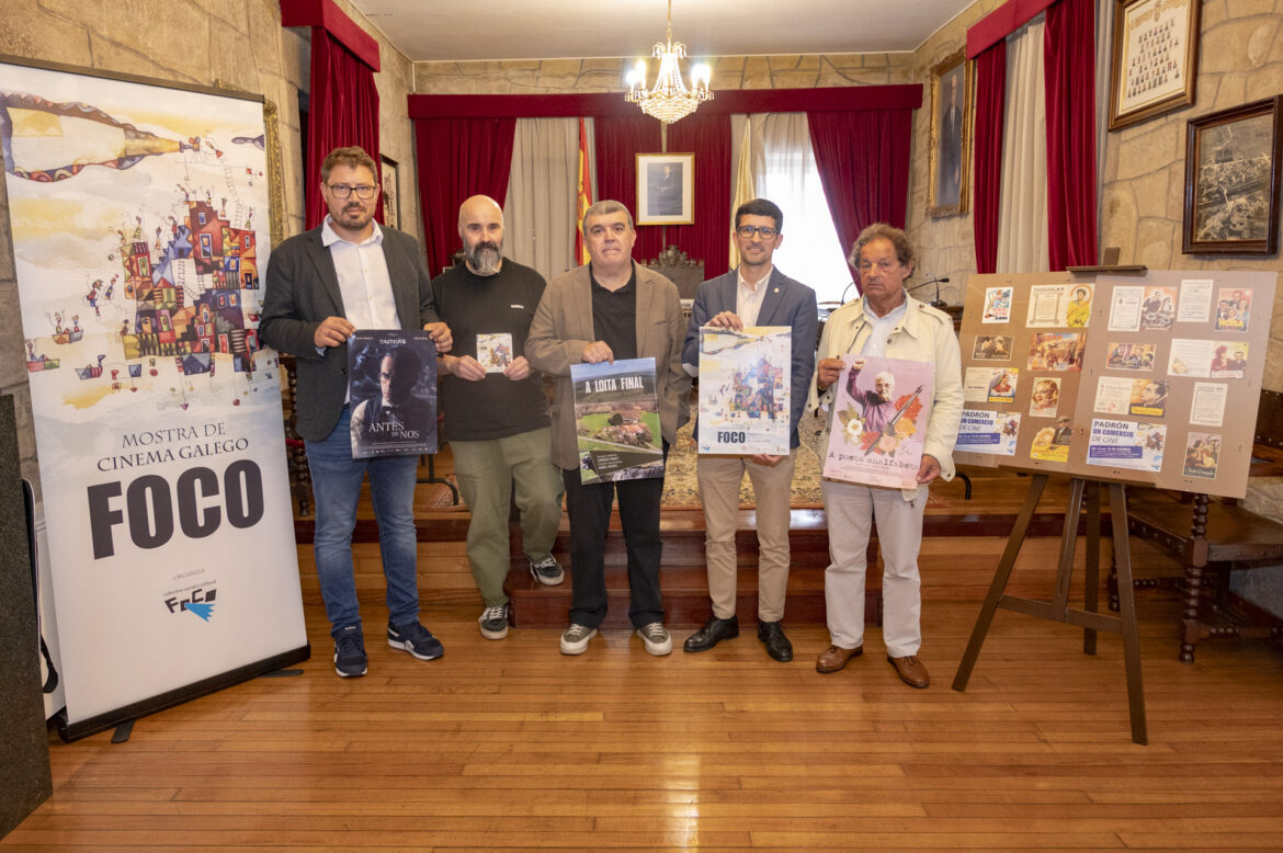 Padrón. 13-10-2025. O Concello de Padrón presentou hoxe na alcaldía a primeira edición da Mostra de Cinema Galego FOCO, que se desenvolverá os días 17, 18 e 19 de outubro en diferentes espazos da vila. No acto participaron o alcalde de Padrón, Anxo Arca, xunto a Javier Figueroa, director de marketing da Corporación Cortizo, Xosé García Lapido, da Fundación Rosalía de Castro, e Fernando Rodríguez, do colectivo FOCO.
