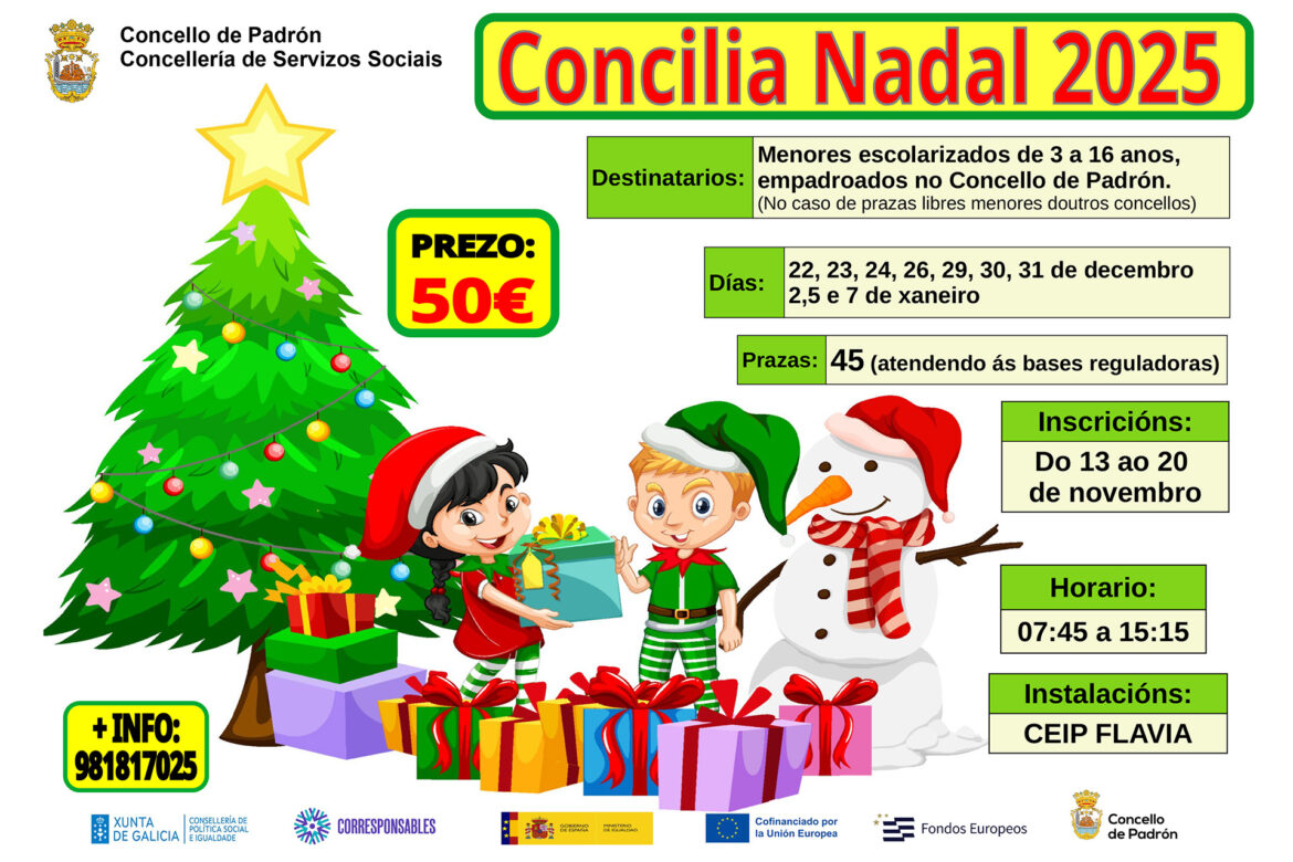 O Concilia Nadal 2025 desenvolverase os días 22, 23, 24, 26, 30 e 31 de decembro, e os 2, 5 e 7 de xaneiro, nas instalacións do CEIP Flavia, en horario de 7.45 a 15.15 horas. O programa está dirixido a menores escolarizados de 3 a 16 anos empadroados no Concello de Padrón. No caso de quedar prazas vacantes, poderán participar tamén menores doutros concellos.