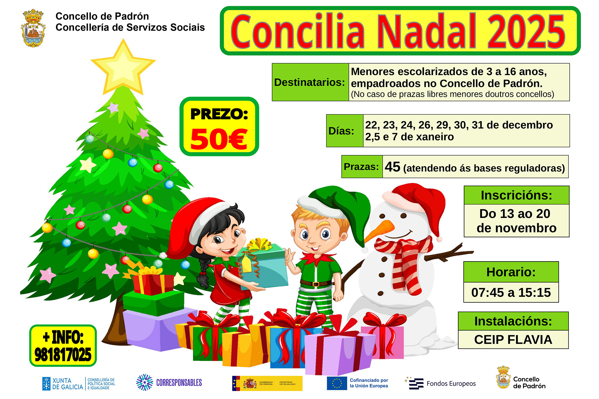 Padrón.11-11-2025.- O programa Concilia Nadal regresa con novidades: nesta edición comezará un día antes e aumenta o número de prazas, pasando de 40 a 45. A iniciativa, organizada polo Concello de Padrón a través da Concellería de Servizos Sociais, ten como obxectivo facilitar a conciliación da vida familiar e laboral durante o período de vacacións escolares.