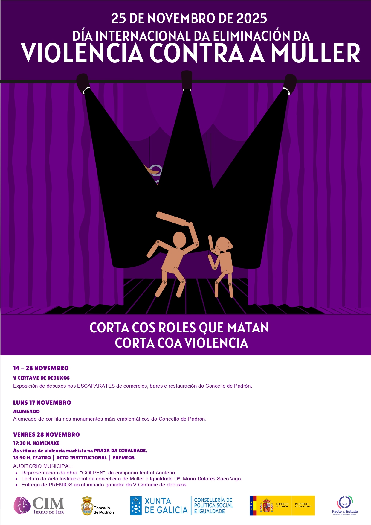 Padrón. 14-11-2025.- O Concello de Padrón, a través do Centro de Información á Muller (CIM) Terras de Iria, pon en marcha un programa de actividades con motivo do 25 de novembro, Día Internacional da Eliminación da Violencia contra a Muller, co obxectivo de sensibilizar á cidadanía, promover a igualdade e contribuír á erradicación de todas as formas de violencia machista.