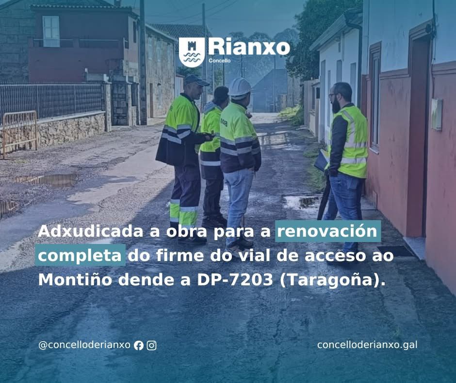 Paralelamente, o Concello tamén adxudicou a renovación completa do firme do vial de acceso ao Montiño desde a DP-7203, en Taragoña. O proxecto inclúe labores de limpeza, rebaixe do pavimento nas zonas onde a pista coincide en cota coas parcelas, bacheo nos puntos máis deteriorados, instalación de novos imbornais e sumidoiros, e a aplicación dun novo aglomerado asfáltico en quente de 6 centímetros de espesor.
