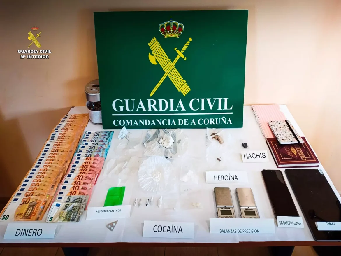 El operativo alcanzó su punto clave el 8 de abril con una intervención en Boiro, continuación de una investigación iniciada en diciembre de 2025. En esta fase se actuó contra una mujer que, tras haber sido puesta en libertad, había retomado la venta de droga desde su domicilio. En el registro se incautaron 203 dosis de cocaína, 118 de heroína, 2,56 gramos de hachís y 2.252 euros.