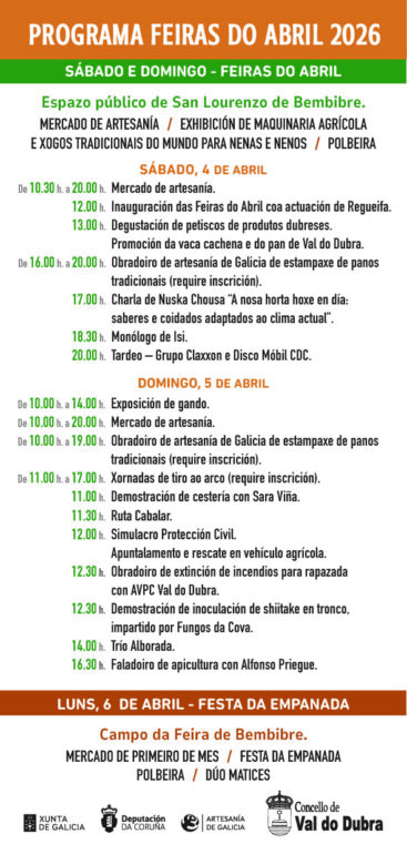 Val do Dubra volverá converterse nun punto de encontro co rural coa celebración dunha nova edición das Feiras do Abril, que terán lugar os días 4, 5 e 6 de abril no espazo público de San Lourenzo de Bembibre. A cita, xa consolidada no calendario local, reunirá durante tres xornadas unha completa programación que combina tradición, divulgación e lecer para todos os públicos.